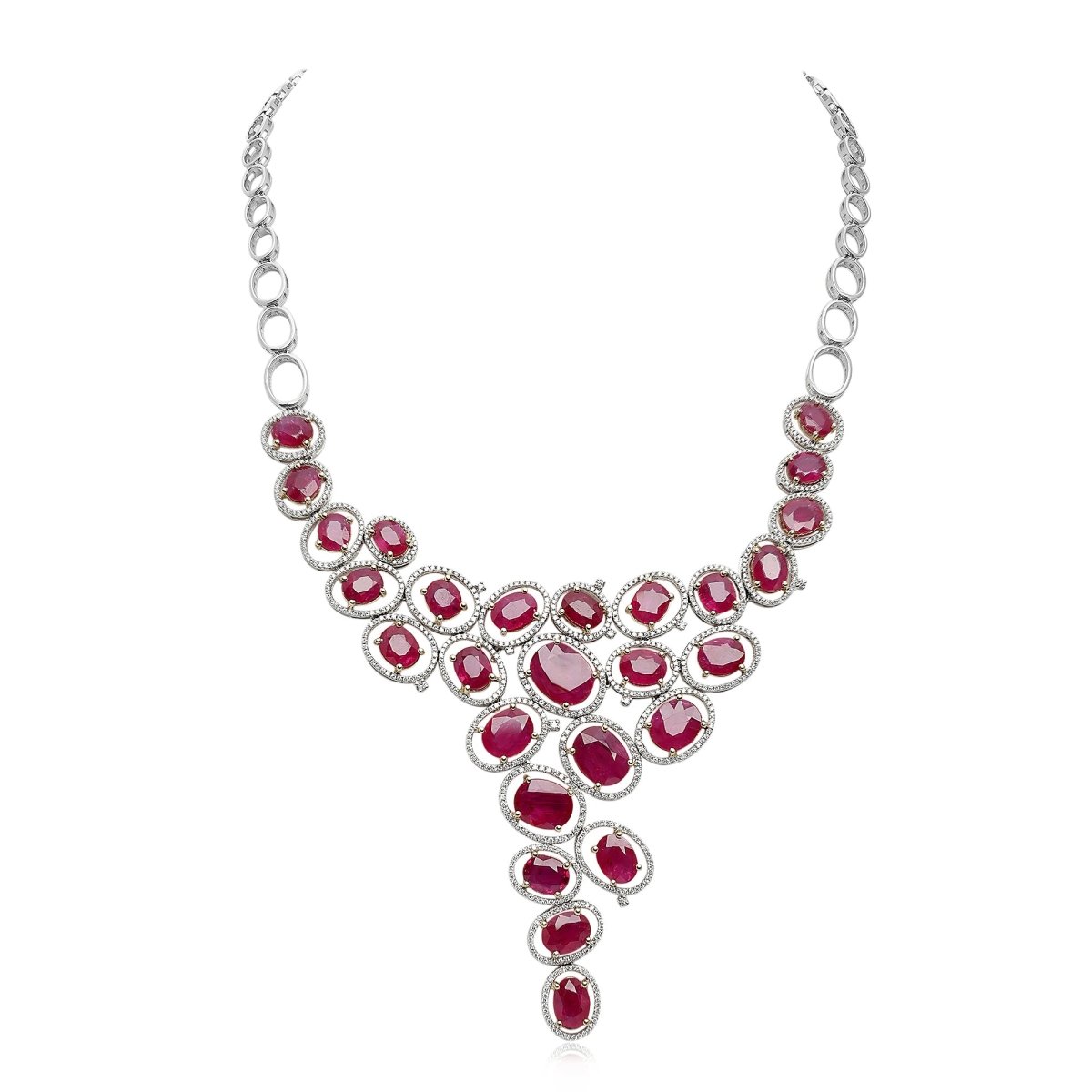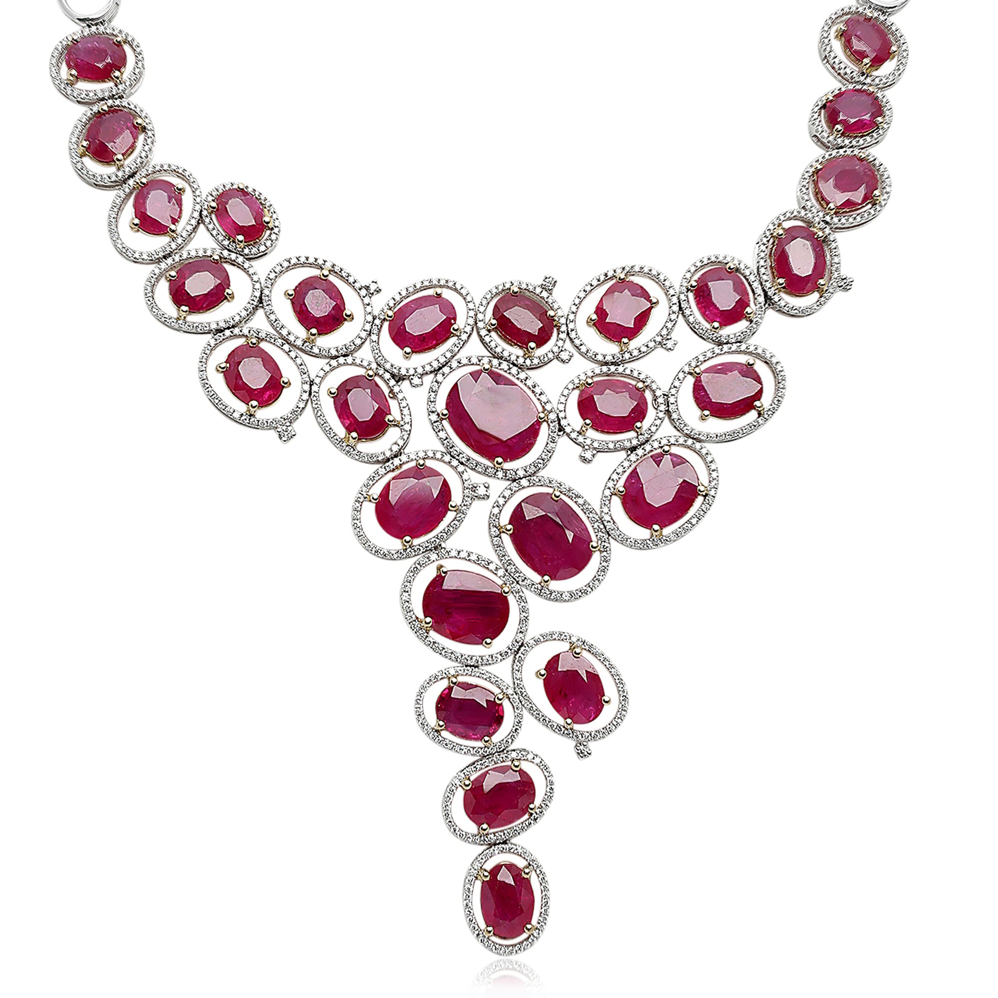 EGL Certified Oval Natural Ruby and Diamond Necklace in 14K White Gold (45.57ctw)